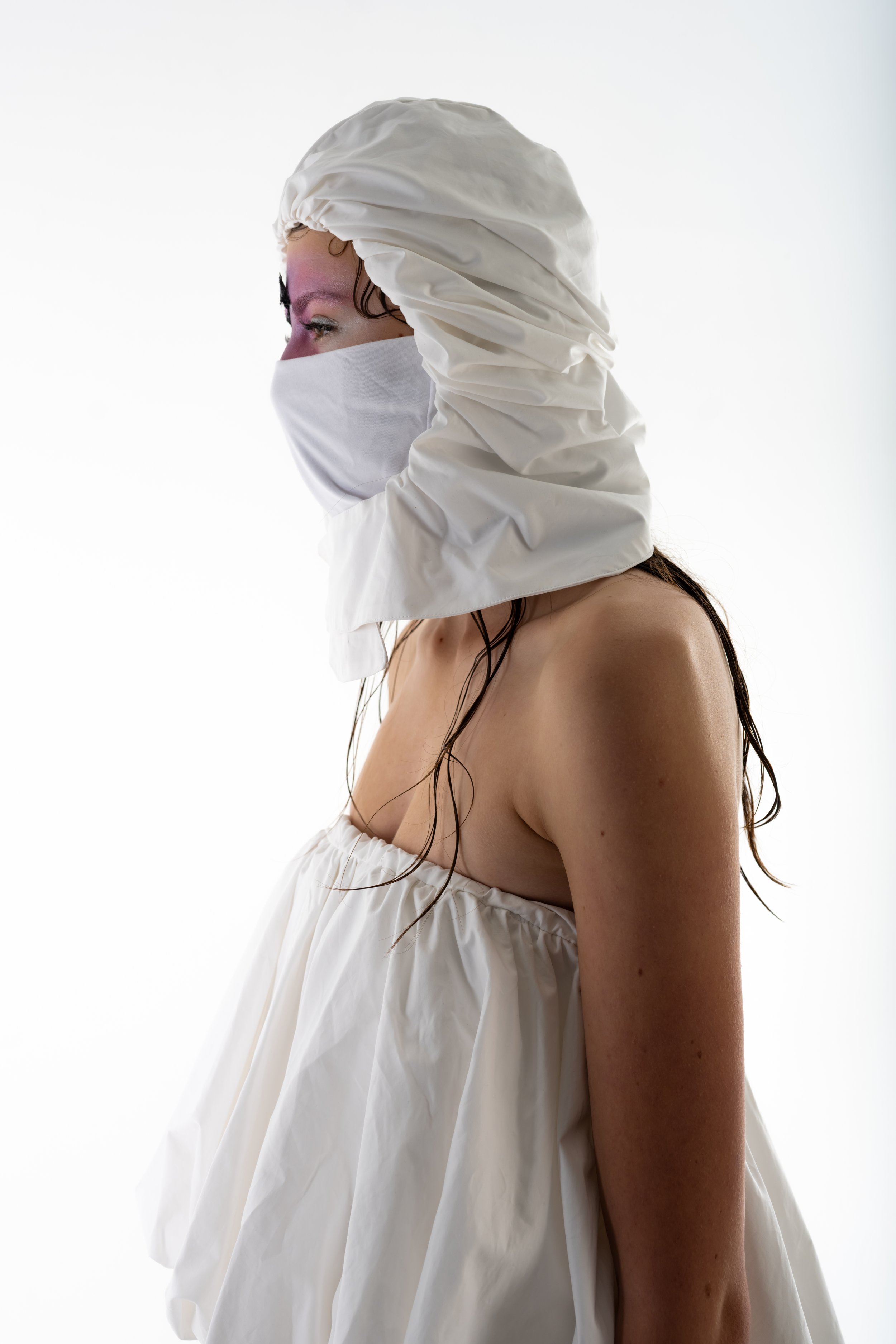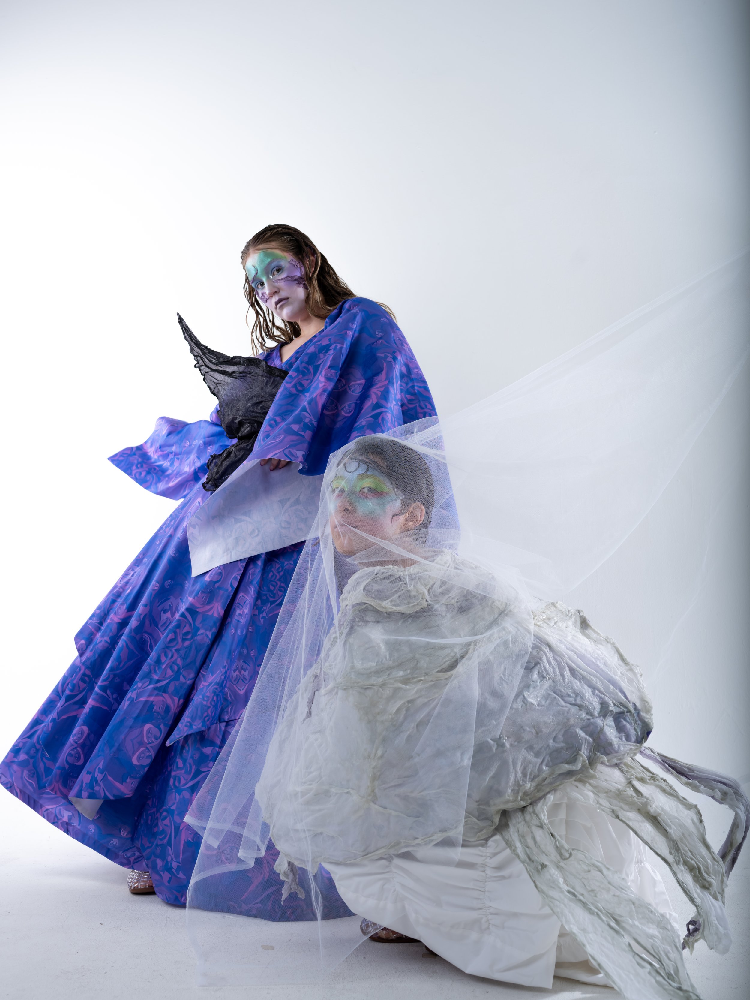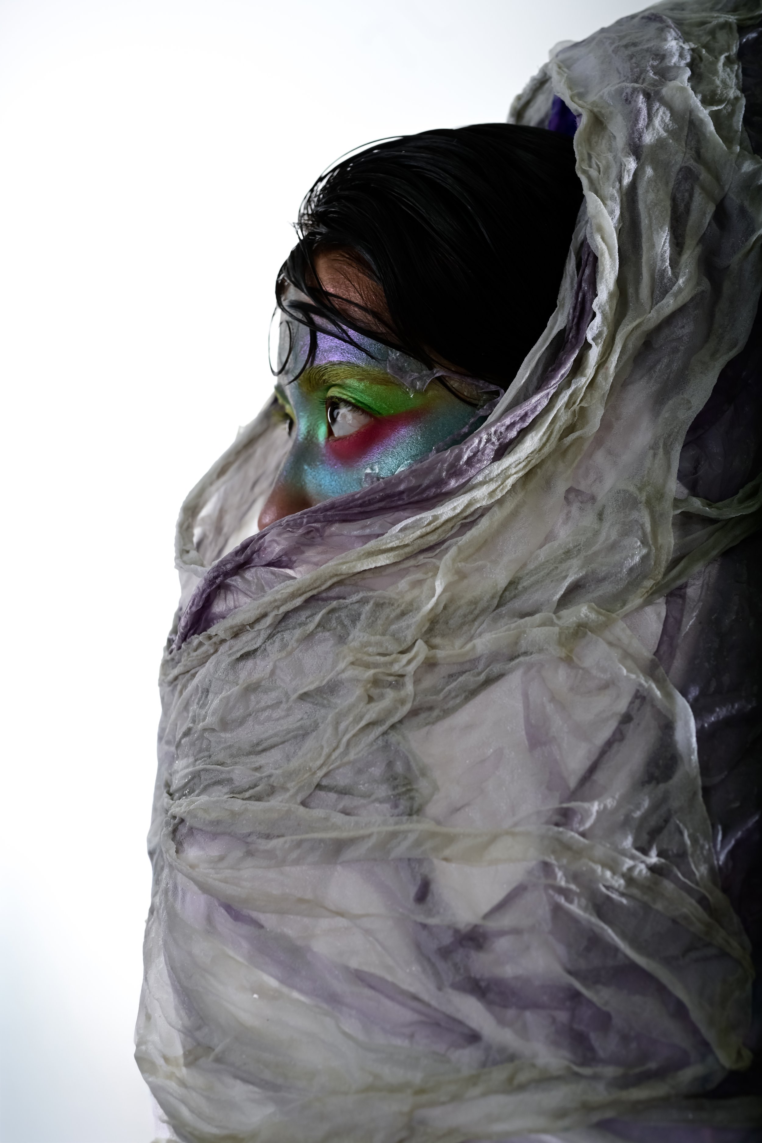 Material consciousness sits at the heart of this transformation. Each garment is created using limited-waste pattern cutting and thoughtful construction techniques, and the entire collection is made from 100% natural fibres, including 100% silk, organic cotton, linen blends, and cotton poplin. Every scrap and offcut is given new purpose through my own custom bioplastic recipe - a biodegradable, resin-like material that allows me to create sculptural, wearable art pieces that echo the metamorphic narrative of the collection. This bioplastic is blended with natural fibres taken from my offcuts and used to form the face accessories, the cocoon headpiece, the cocoon overskirt, and the Emergence top. Through this process, Metamorphia becomes both an emotional and material metamorphosis - proving that nothing within the third space is wasted, and that every fragment, like every identity in transition, holds the power to transform.