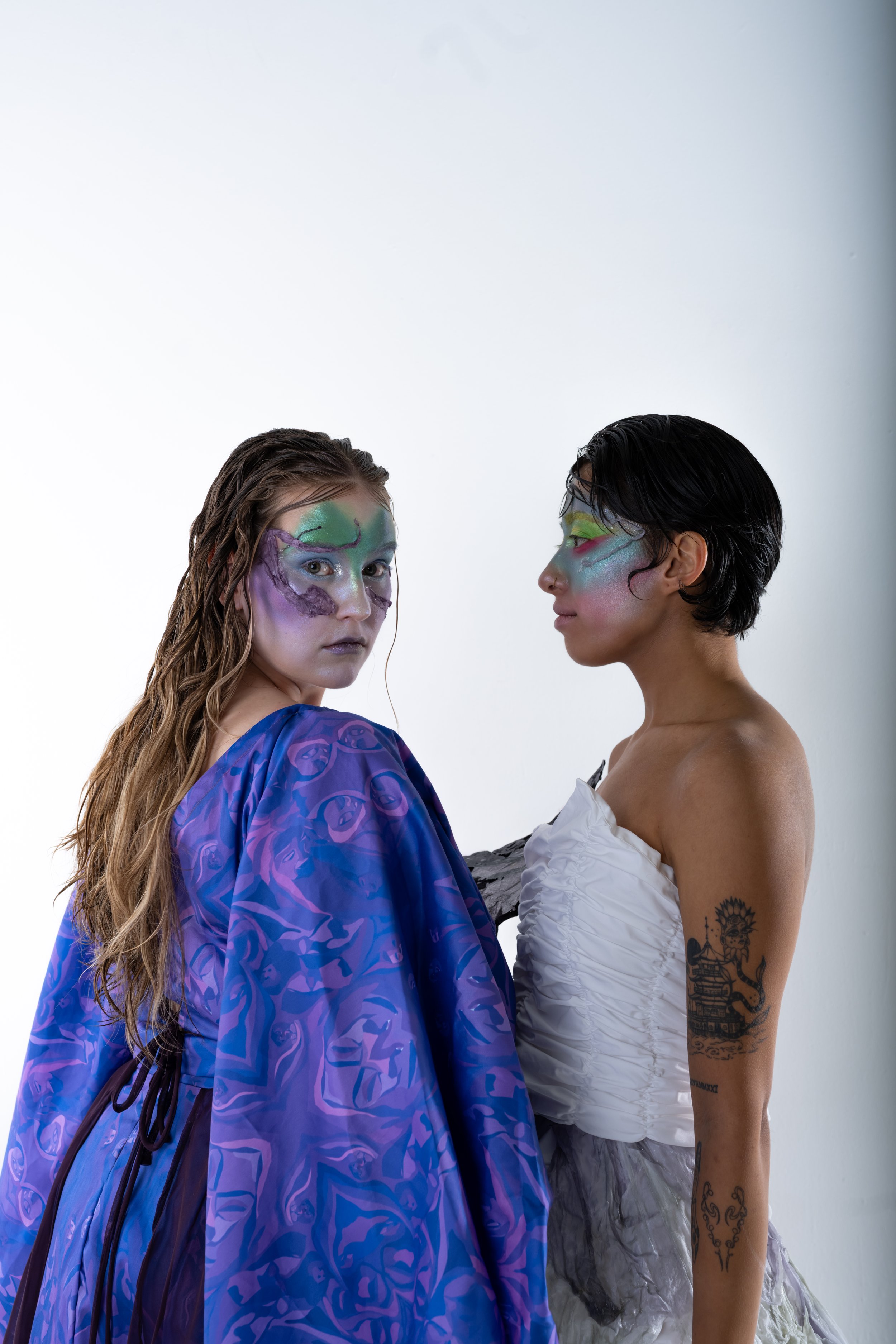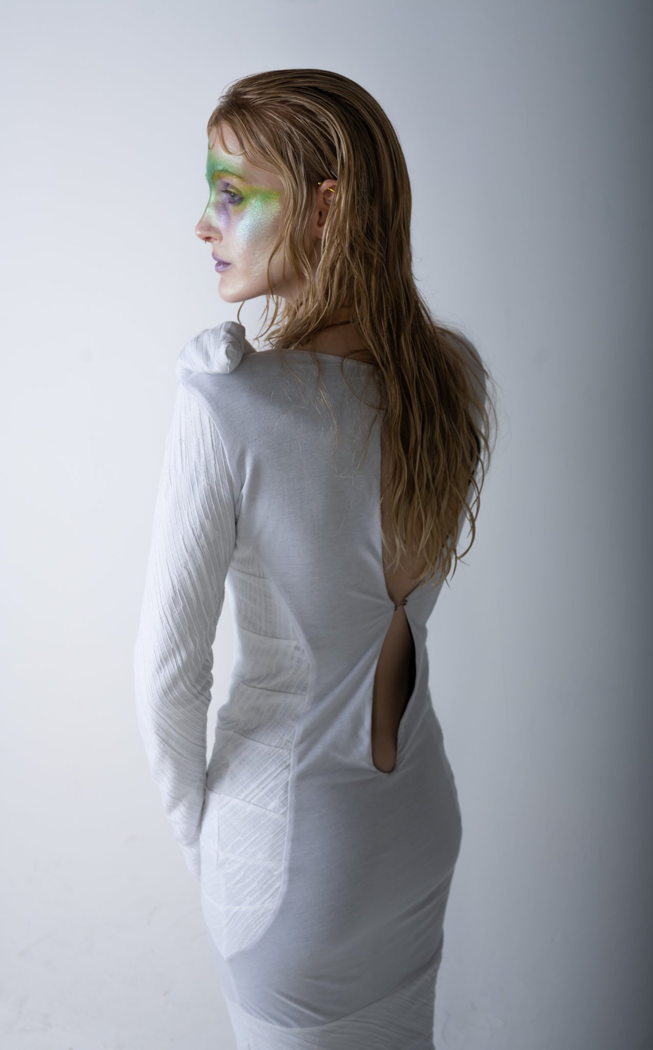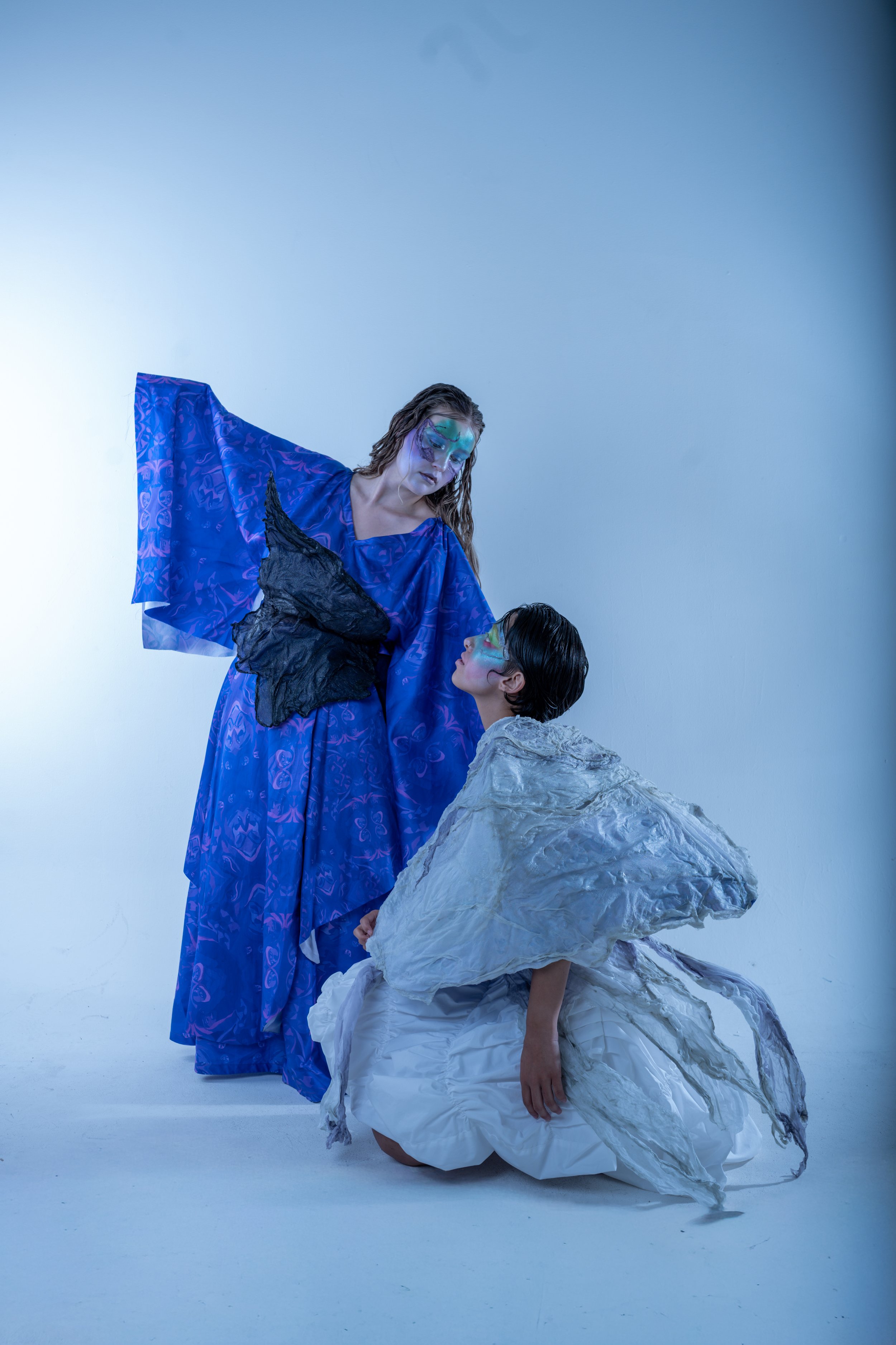 Material consciousness sits at the heart of this transformation. Each garment is created using limited-waste pattern cutting and thoughtful construction techniques, and the entire collection is made from 100% natural fibres, including 100% silk, organic cotton, linen blends, and cotton poplin. Every scrap and offcut is given new purpose through my own custom bioplastic recipe - a biodegradable, resin-like material that allows me to create sculptural, wearable art pieces that echo the metamorphic narrative of the collection. This bioplastic is blended with natural fibres taken from my offcuts and used to form the face accessories, the cocoon headpiece, the cocoon overskirt, and the Emergence top. Through this process, Metamorphia becomes both an emotional and material metamorphosis - proving that nothing within the third space is wasted, and that every fragment, like every identity in transition, holds the power to transform.