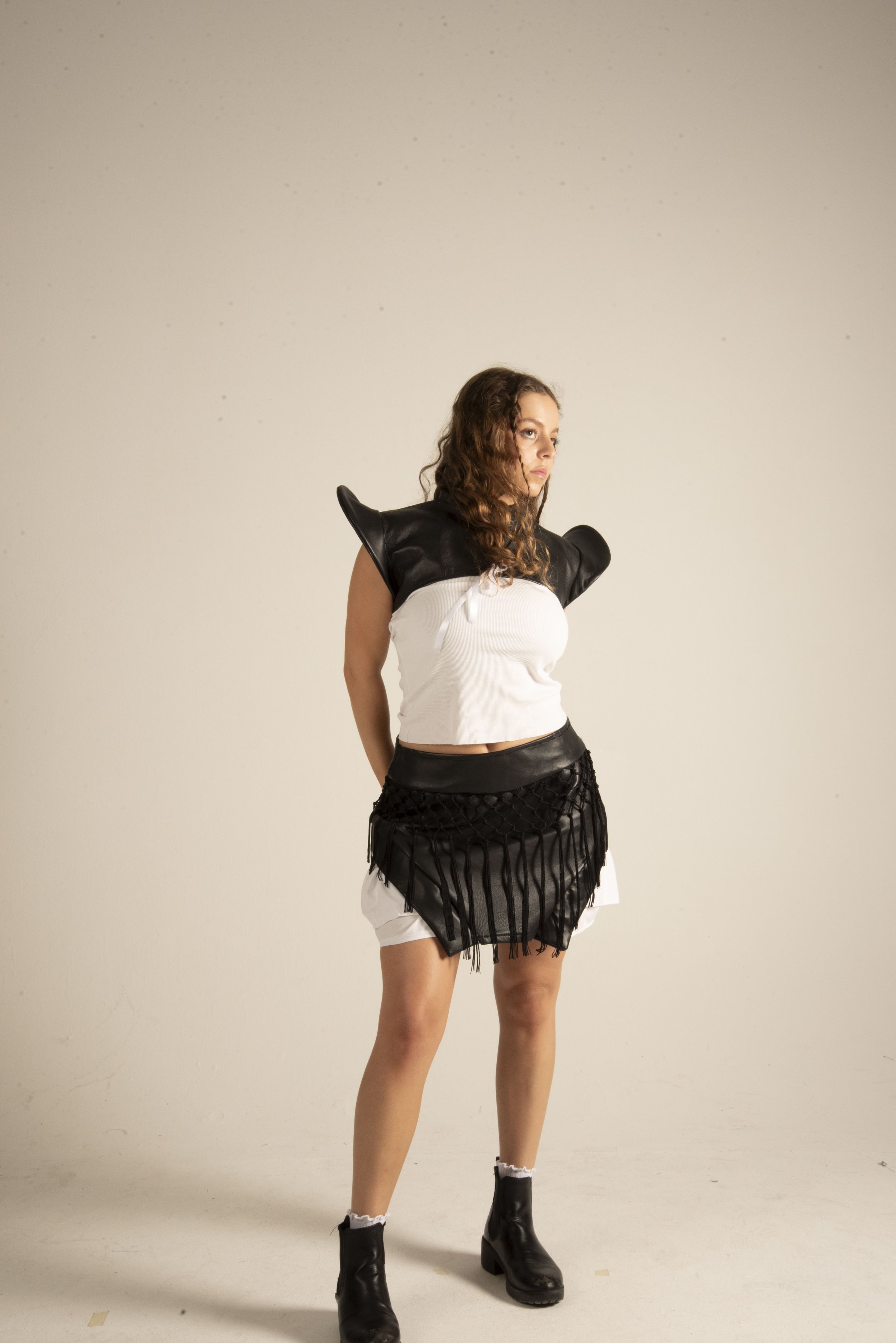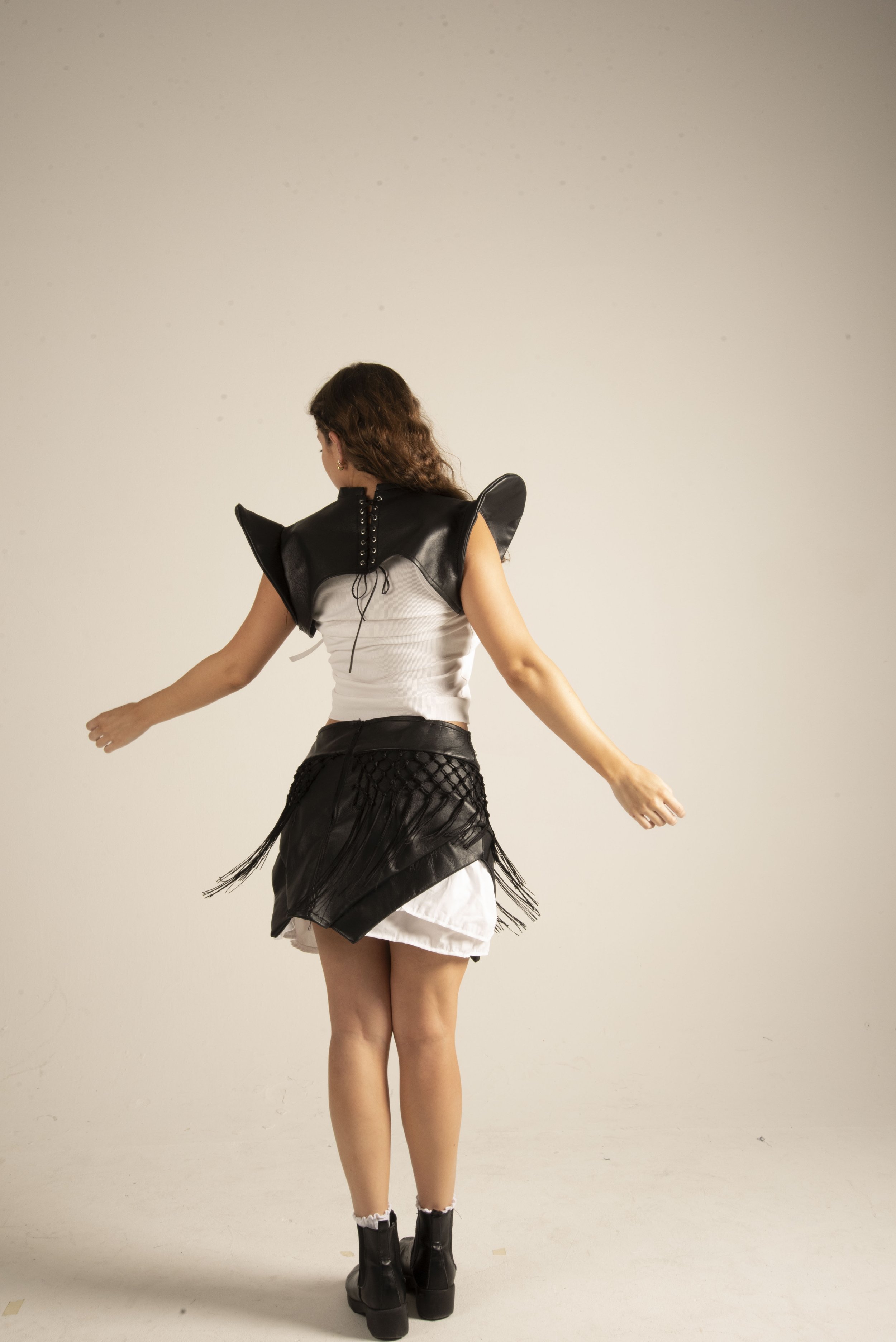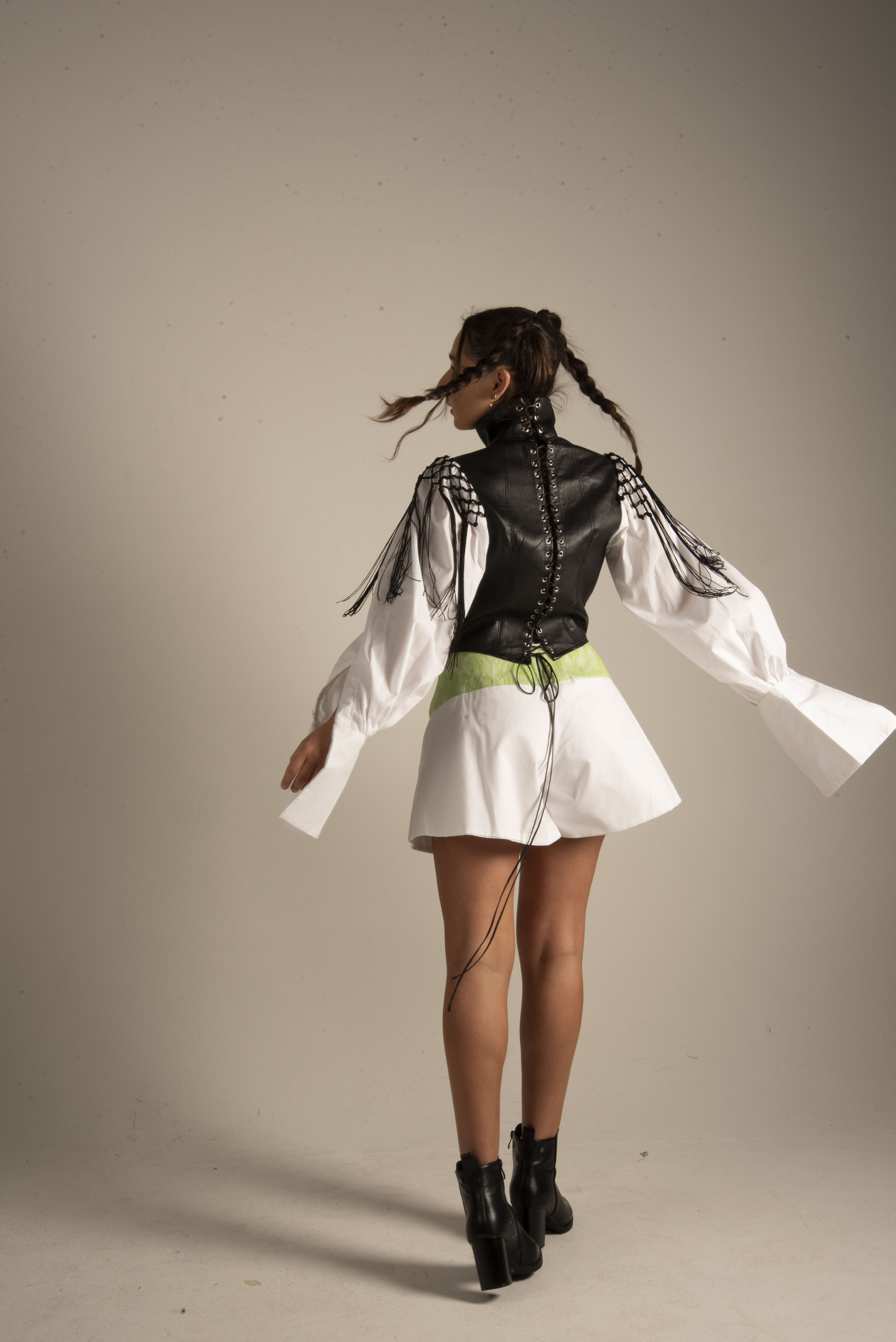 The collection features a carefully curated selection of material: sheepskin leather, organic poplin cotton, and stretch lace, each chosen to enhance the theme of contrast, both texturally and visually. These fabric choices reflect the tension between structure and softness, tradition and modernity.