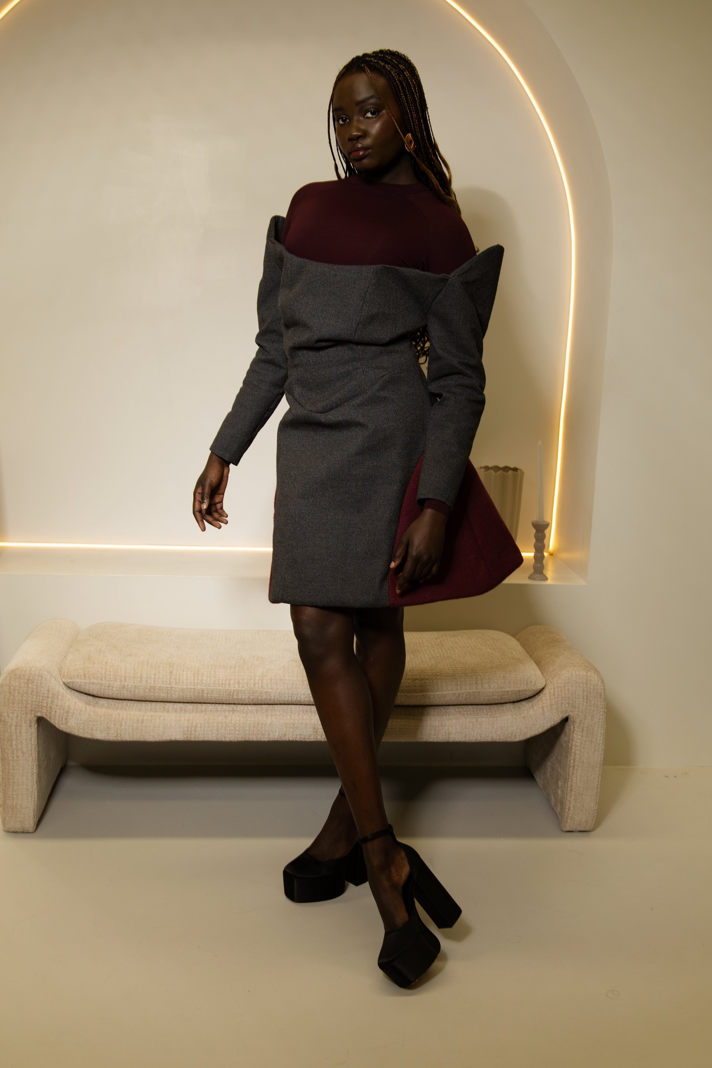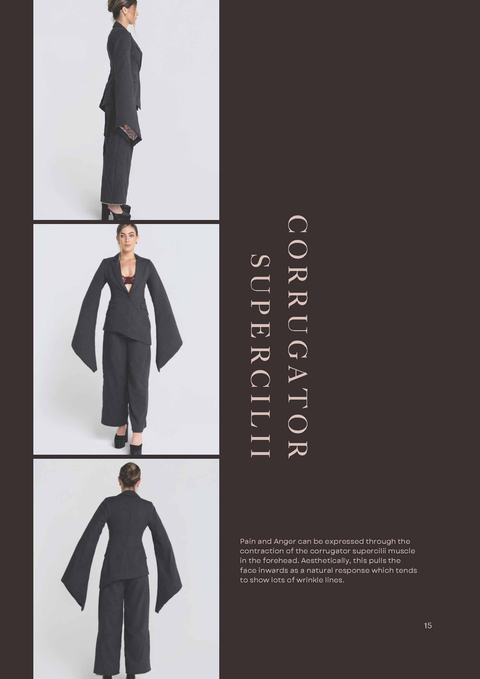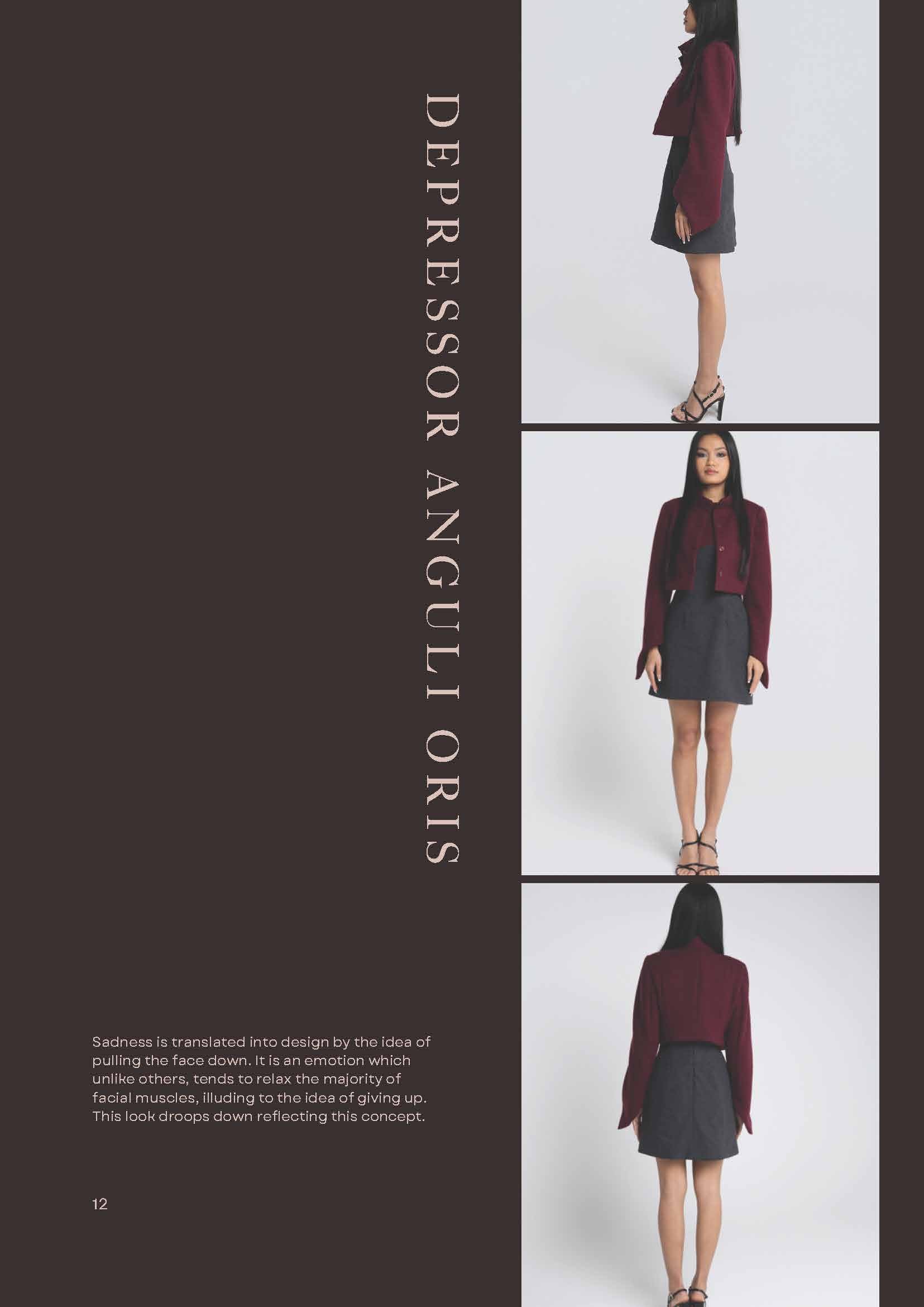 UnFace43 is a limited commercial fashion collection that links the FACS system with the visual anatomy of emotion. Each garment is a study of the body’s silent language and how muscular response can be carved into cloth anchored by emotions of joy, fear, sadness, anger and surprise. These have been deconstructed visually through an analysis into the muscular movements that build up each emotion and how the face is contorted. The looks are named after the most prominent of each of the muscles, shining a light into how emotion provokes these involuntary muscular movements. An Autumn-Winter ready-to-wear collection designed after intensive theoretical research into the FACS system and further research into how the pulse of emotion can be applied to fashion through a classic cross contemporary way. The collection is highly structured and tailored to reflect the muscles which move and evolve through the body. With a traditional Parisian grey anchoring the collection and highlights of a deep wine burgundy, emotion is not only worn but is constructed for further reflection.